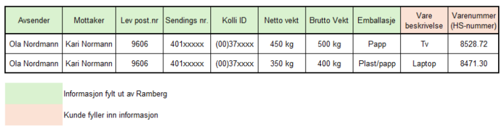 - Emballasjeinformasjon (kollitype, antall kolli og eventuell merking)